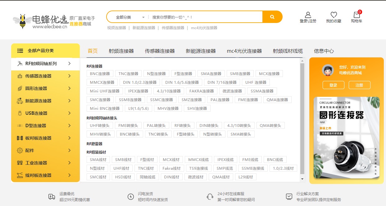 电峰优选是一个专业的连接器采购,线上批发销售商城,不仅整合了多年所积累的供应链和技术资源,还严格把控供应商资质,确保所有连接器产品都是从工厂直接拿货,不存在中间商渠道。平台产品覆盖DIN转接头,QMA转接头,MHV转接头,BNC转接头,种类齐全。https://www.elecbee.cn/ https://www.elecbee.cn/category-1751.html https://www.elecbee.cn/category-1753.html https://www.elecbee.cn/category-1769.html https://www.elecbee.cn/category-1528.html
